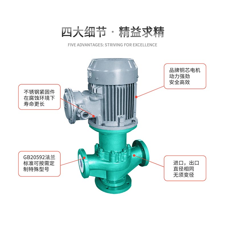 • GFMC氟塑料立式磁力管道泵是一種采用立式安裝方式,具有耐腐蝕泵的優(yōu)點(diǎn)無泄漏管道磁力泵,泵進(jìn)出口徑相同,結(jié)構(gòu)緊湊、占地面積小、進(jìn)行無泄漏運(yùn)轉(zhuǎn);且位于同一中心線上,材質(zhì)優(yōu)良,泵體、葉輪、隔離套等過流部件均采用氟塑料合金制造,葉輪直接與電機(jī)軸連接,高效、節(jié)能、低噪音,能有效的平衡泵運(yùn)轉(zhuǎn)產(chǎn)生的徑向和軸向負(fù)荷;