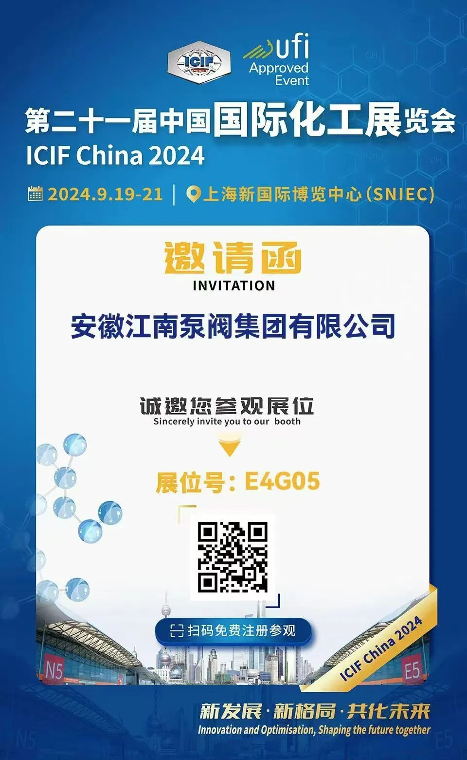 安徽江南泵閥集團(tuán)有限公司于2024年9月19日-21日在上海新國際博覽中心參加第二十一屆中國國際化工展覽會(huì),展位號(hào)為E4G05。我們誠摯邀請您蒞臨展位參觀指導(dǎo)!